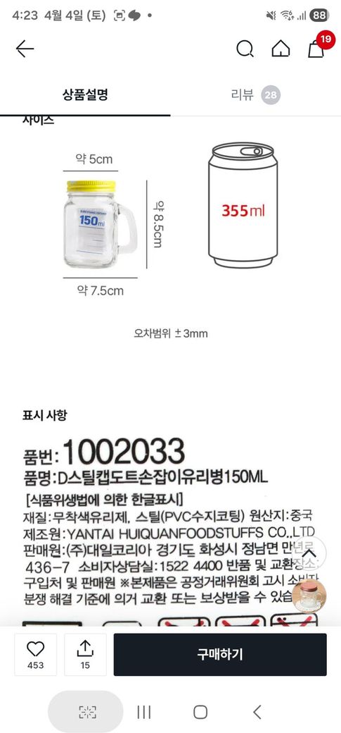 사진 에 있는 유리병 뚜껑이 5cm 인데요