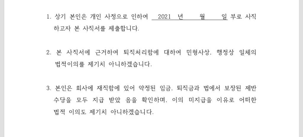 이용하면 될 것으로 보입니다. 다만 동의하지 않는 부분이 있다면 사직서 문구의 변경을 요청하시거나 동의하지 않는 부분에