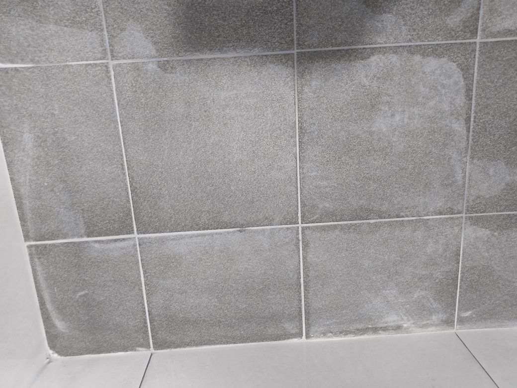 화장실 바닥 타일 교체 공사 후 물청소를 해도 하얀부분이 지워지지 않습니다.사진첨부했습니다.바닥타일은 미끄럼 방지용으로 돌기가 있습니다.