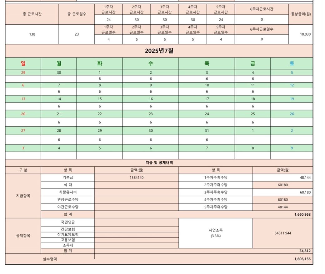 해당 방식으로 주휴수당을 계산한 것에는 위와 같이 6월 마지막주차, 8월 1주차에 1일분 주휴수당이 반영될 경우 위법한 것은 아닙니다.