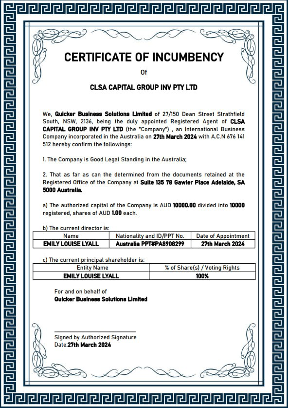 보내주신 사업자 등록증이라고 하는 certificate of incumbency의 경우 호주의 설립된 회사의 사업자 등록으로 추정됩니다. 다만 그 내용에 있어서 실제 서명이나 기타 발급의 진위, 즉 위조 여부를 확인하기 어렵기 때문에 각별한 주의가 필요해보입니다. 사기의 가능성도 배제하기 어렵다고 보여집니다.