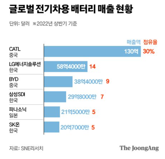 우리나라의 전기차용 배터리매출은 전체 시장에서 LG엔솔과 삼성SDI 그리고 SK온을 합한다면 대략적으로 26%정도의 점유율을 보이고 있으며 점차적으로 점유율을 늘려나가고 있는 상황입니다.