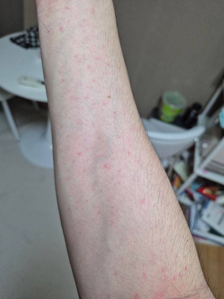 장염 걸렸었고 약도 먹는중이거든요 오늘 장염 거의 괜찮아져서 운동하고 집와서 씻는데 보니까 몸이 이렇게 돼있는데 왜이러는걸까요.. 만져지진 않고 그냥 빨갛게만 변하고 가렵지도 않아요