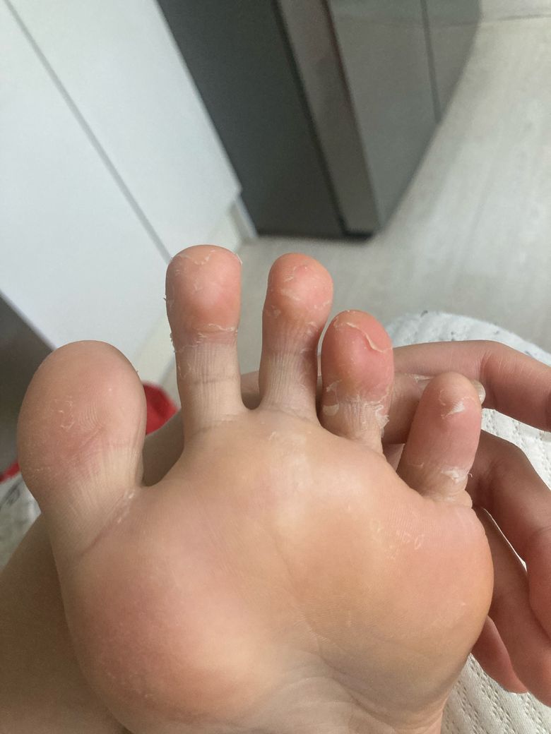 두꺼운 양말을 신고 오래 서 있으면 발에 열과 습기가 차면서 각질층이 불어나고 약해집니다. 이 상태에서 반복적인 마찰이 가해지면 피부가 얇게 벗겨지는 양상이 나타납니다. 다만 사진처럼 발가락 끝과 사이 주변으로 하얗게 일어나며 점점 퍼지는 형태는 곰팡이 감염이 동반된 경우에서도 흔히 보입니다. 가려움이 없는 초기 무좀도 충분히 가능합니다.