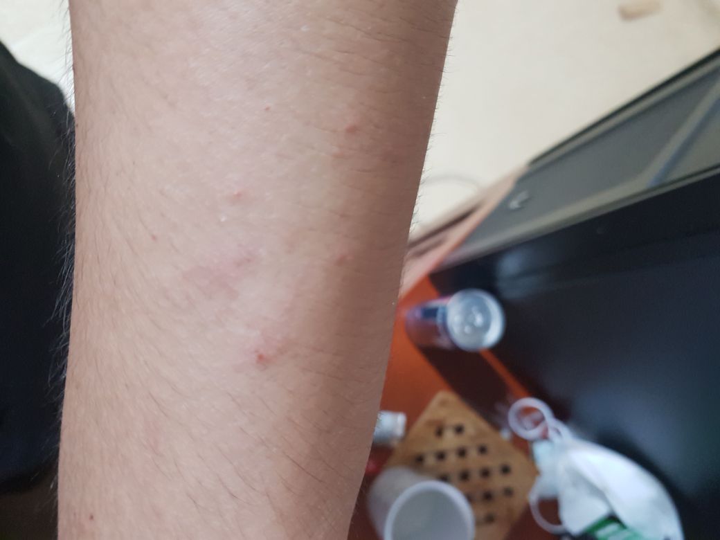 - 해당 부위에 대한 미열과 가려움증이 있습니다. 눈으로 관찰 가능한 부분은 왼 팔에 난 수포가 유일합니다.