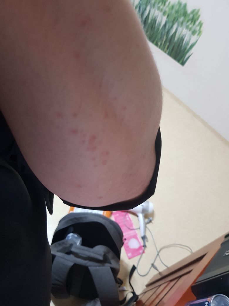 - 금일 오후 부드러기 같이 올라온(사진 참고) 수포를 발견했습니다. 약간의 미열과 무기력감이 있습니다.