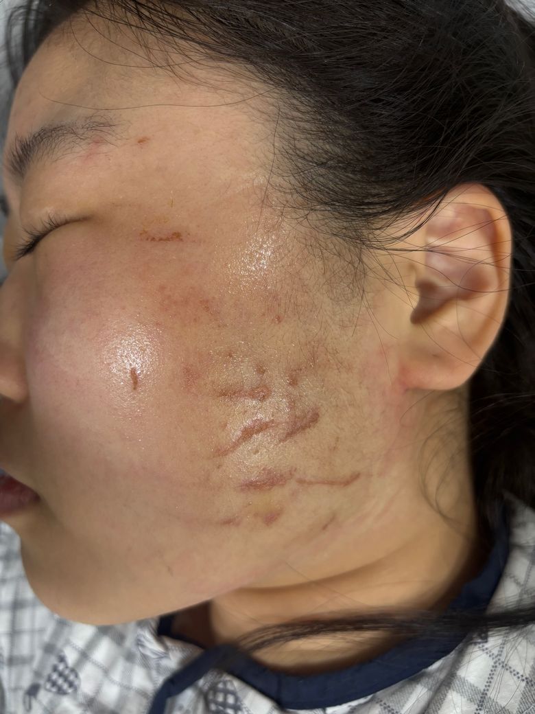 4. 3번째 후 15일만에 등원하고 닌텐도 위 게임 활동 시작하려고 할때 제가 같이 게임하자고 말을 하자마자 공격해서 저의 둘만 있어서 머리끄댕이와 얼굴을 긁어서 왼쪽얼굴이 엄청 긁혀서 진피층까지 심각한 상처들과 왼쪽 손목,목뒤를 다쳤고 상해진단을 받았습니다. 후유증으로 얼굴에 3년이상의 상처 치유기간과 지속적인 상처가 남아있을 수 있다는 말을 들었습니다. 지금 현재는 입원 중에 있으며, 기관에서는 산재처리 100퍼센트로 산재를 신청해놓았습니다.-이유: 장애인 당사자가 맨날 끼는 장갑을 안가져왔다고 저를 공격했습니다.