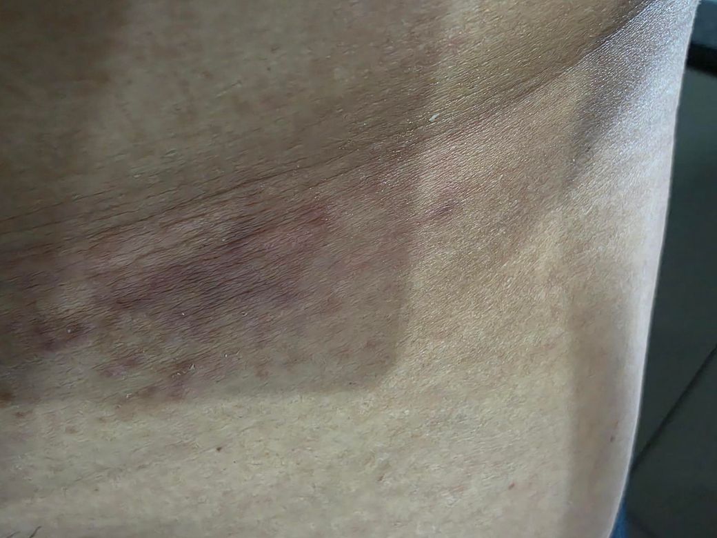 경계가 사각형처럼 보이는 건 이전에 바른 연고가 번지는 패턴, 혹은 습기·마찰이 반복된 면적 때문