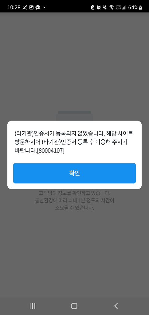 해당 내용은 말 그대로 타 기관의 금융인증서가 우리은행에서 사용할 수 있도록 인증서 등록을 하지 않았기 때문에 사용을 하지 못하는 것이에요. 일단 우리은행의 고객센터에 전화를 하셔서 화면공유를 통해서 설정을 다시 해보도록 하시는 게 좋을 것 같아요