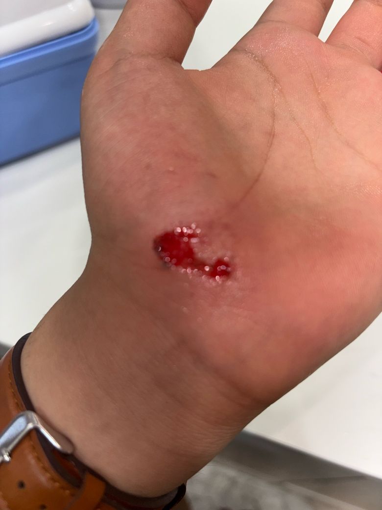 일단 사진상으로는 살점이 일부 떨어져 나가면서 진피의 일부가 노출이 된 것으로 보입니다. 다만 출혈이 지속되는 상태가 아니라면 당장 응급실에 방문할 정도는 아닐 것으로 보입니다.