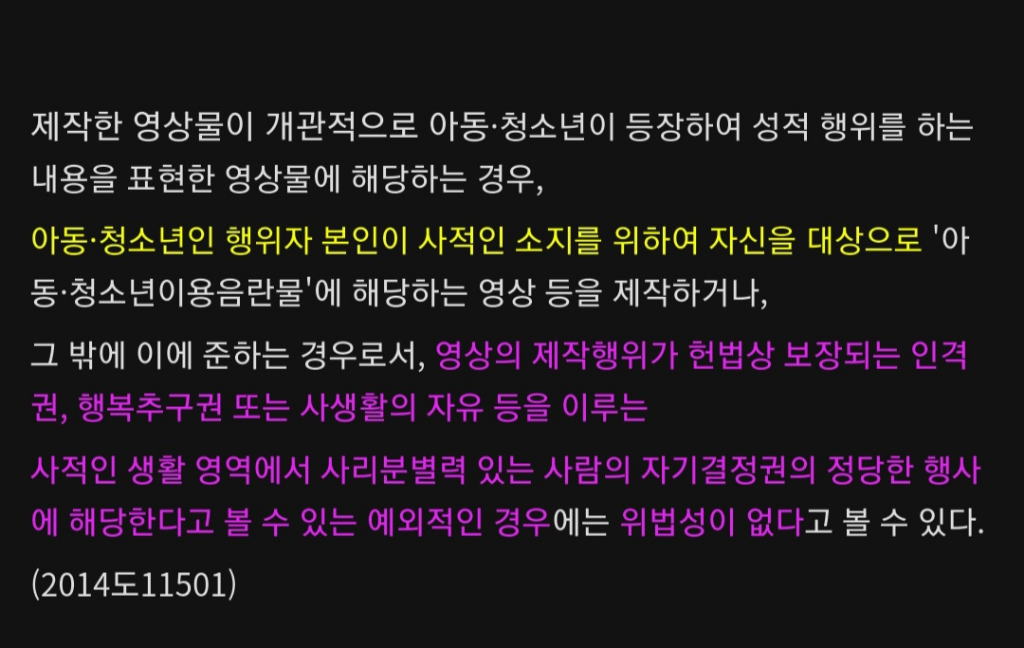하지만 예외적으로 미성년자의 자기결정권을 존중하기 위해 미성년자가 자기 의지로 음란물을 제작하고 배포하는 행위를 아청법 위반으로 보지 않는 사례도 있습니다.