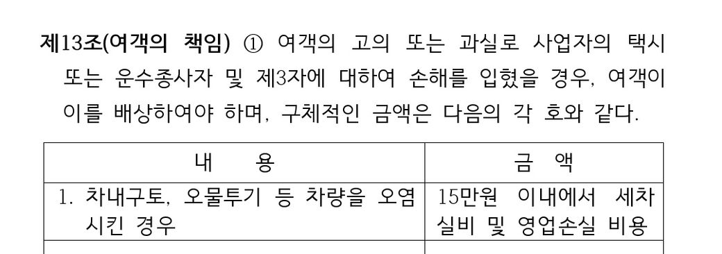 부산광역시 택시운송사업 운송약관에 따르면아래와 같이 세차 실비 및 영업손실비용이 15만원 이내로만 가능하다고 합니다.