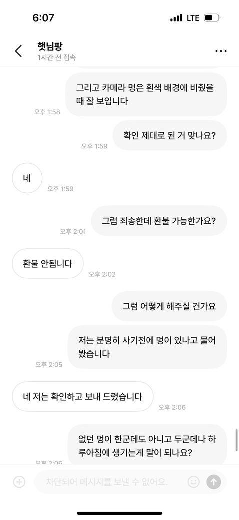 번개장터에서 중고 아이폰을 구매했습니다. 구매하기전 카메라에 멍이 있냐고 물었고 이상 없다고 답해서 믿고 구매를 했습니다. 전날 결제하고 오늘 배송이 와서 바로 확인해보니 카메라에 멍이 두군데나 있었습니다. 저는
