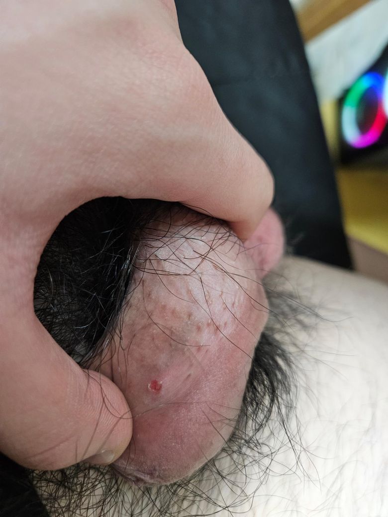 사진을 통해서 보았을 때에는 모공각화증이 있어 보이며 모낭염이 생긴 것을 짠 뒤에 상처가 난 것이 아닌가 싶어보이는 소견이 있습니다. 단편적인 정보로는 보다 자세하게 평가를 하기는 어렵습니다. 관련하여서는 비뇨의학과적으로 진료 및 검진을 통한 구체적인 상태 감별을 받아보시는 것을 권고드립니다.