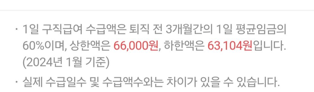 평균임금의 60%로 구직급여일액을 책정하나 그 값이 상한액인 66,000원을 초과하면 66,000원이, 하한액인 63,104원에 미달하면 63,104원이 적용된다는 것을 의미합니다.