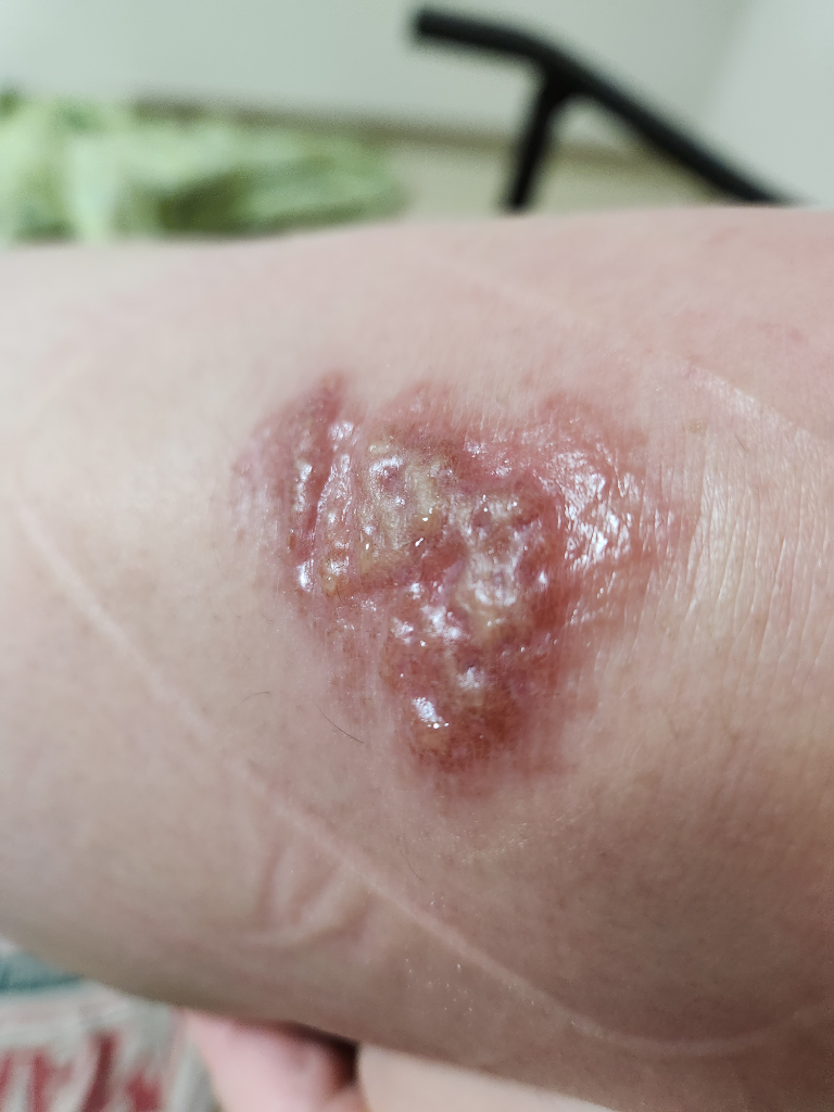 진물이 말라가면서 병변을 덮고 있어 염증이 발생할 가능성이 있습니다.