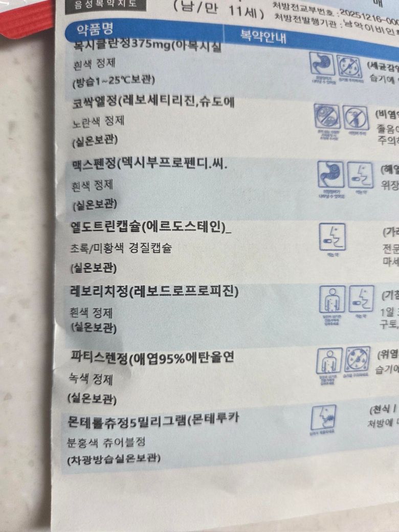 사진의 처방에는 이미 기침 억제 성분(레보드로프로피진)과 가래약(에르도스테인) 그리고 콧물약이 포함돼 있어, 코대원포르테시럽을 추가하면 기침약 성분과 항히스타민 그리고 기관지 확장 성분이 겹쳐 졸림, 두근거림 같은 부작용이 늘 수 있습니다. 특히 11세는 코대원포르테의 디히드로코데인 성분 특성상 임의 추가복용을 권장드리지 않습니다. 지금은 처방약대로 드시고, 밤에 기침이 계속되면 처방기관에 “야간 기침이 심하다”로 약 조정(용량 또는 성분 변경)을 받는 쪽이 안전합니다. 당장 도움이 되는 방법으로는 실내 습도 40에서 60퍼센트 유지, 미지근한 물 자주 마시기, 잘 때 상체를 약간 높이는 방법을 함께 권장드립니다. 감사합니다.