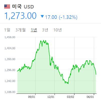 먼저 달러환율의 경우 아래와 같이 작년 하반기에 약 1450원 정도까지 올랐다가 오늘 기준으로는 1273원으로 내려왔습니다.