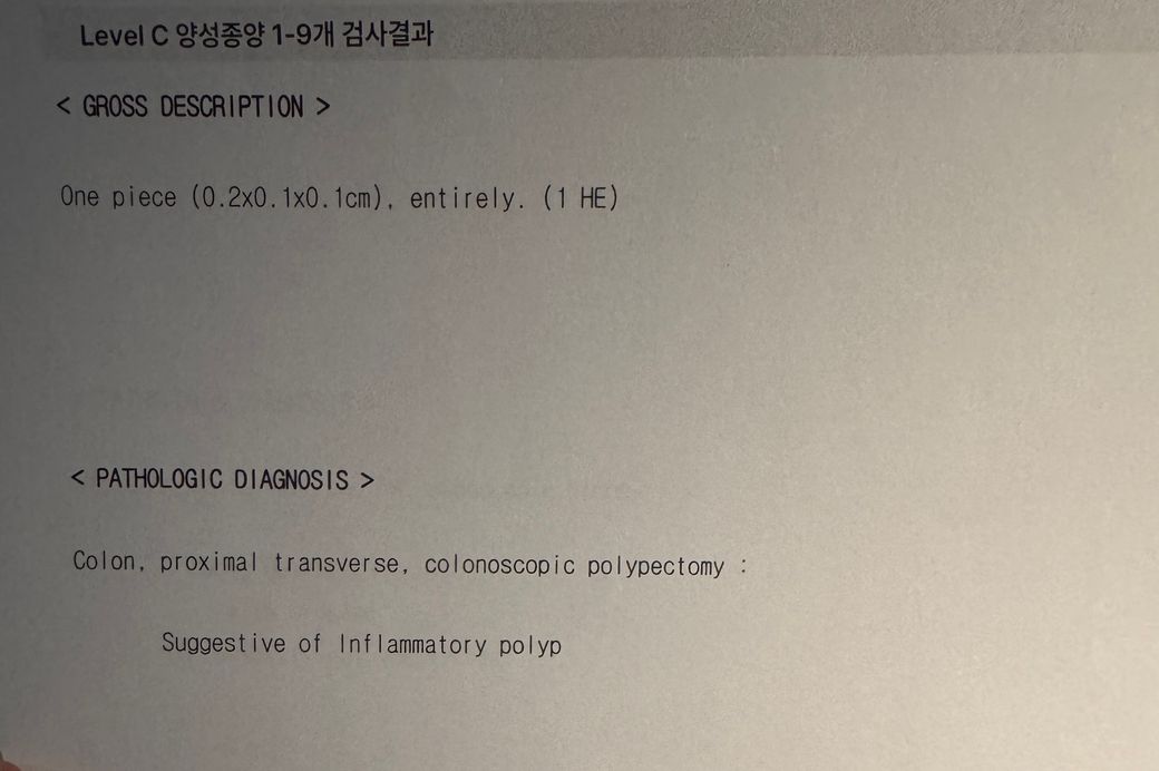 정리하면, 위는 만성 위염 수준이며 위축성 위염이나 전암성 병변은 확인되지 않았고, 대장 용종도 양성 염증성 용종 소견입니다. 현재 결과만으로는 안심하셔도 되는 상황으로 보입니다. 다만 추후 추적 내시경 주기는 담당 소화기내과에서 연령, 증상, 가족력 등을 종합해 결정하는 것이 바람직합니다.