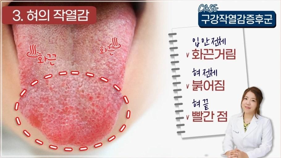 구강작열감증후군은 구강 점막이 화끈거리거나 따끔거리거나 통증 등이 반복되는 만성질환입니다. 현재 나타나는 증상은 구강작열감증후군과 일치하지는 않는것 같습니다. 한방에서 설진으로 진단해보면 혀끝이나 가장자리가 붉게 도드라지는 것은 상기도 감염이나 건조증 등이 원인이 될 수 있습니다. 혹은 알러지 질환에서 나타날 수 있는 반응입니다
