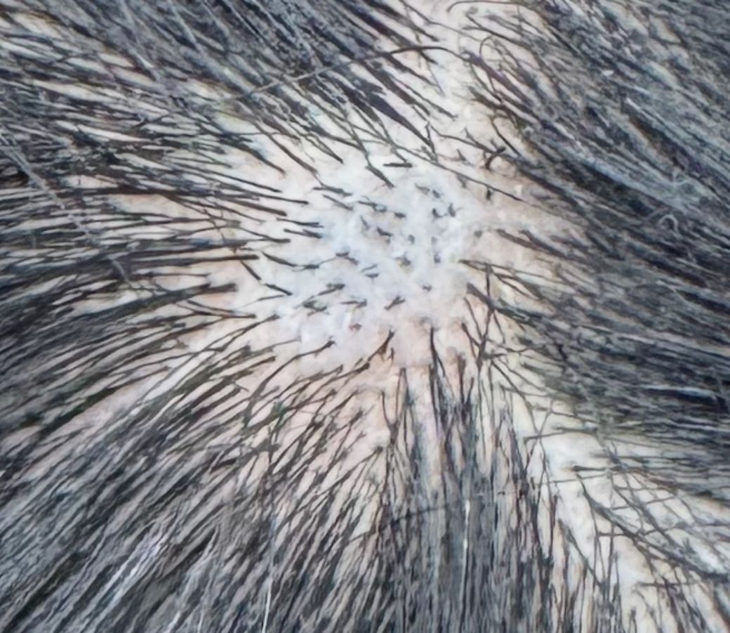올려주신 사진에 병변이 잘 보이진 않아요. 그냥 머리카락이 없고 하얗게 변색된 두피로 보입니다
