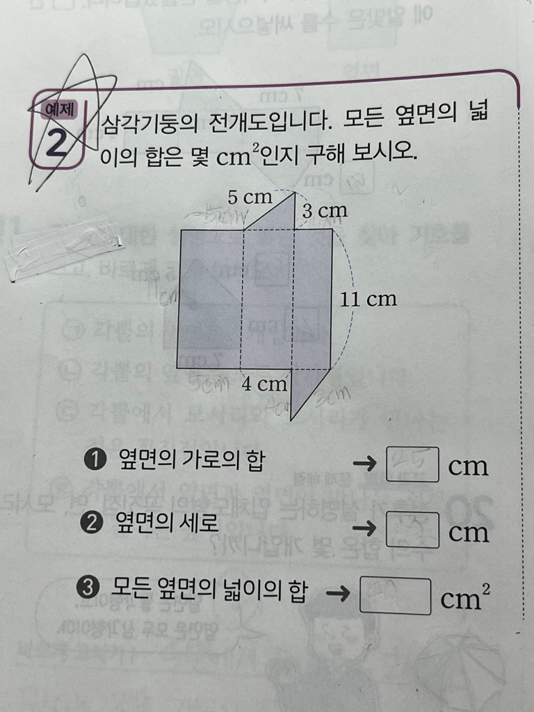 1.옆면의 가로중 3과4는 나와있고,나머지 표시안된곳은 전개도를 다시 접었을때 삼각형의 5와 같은 길이니까 5cm