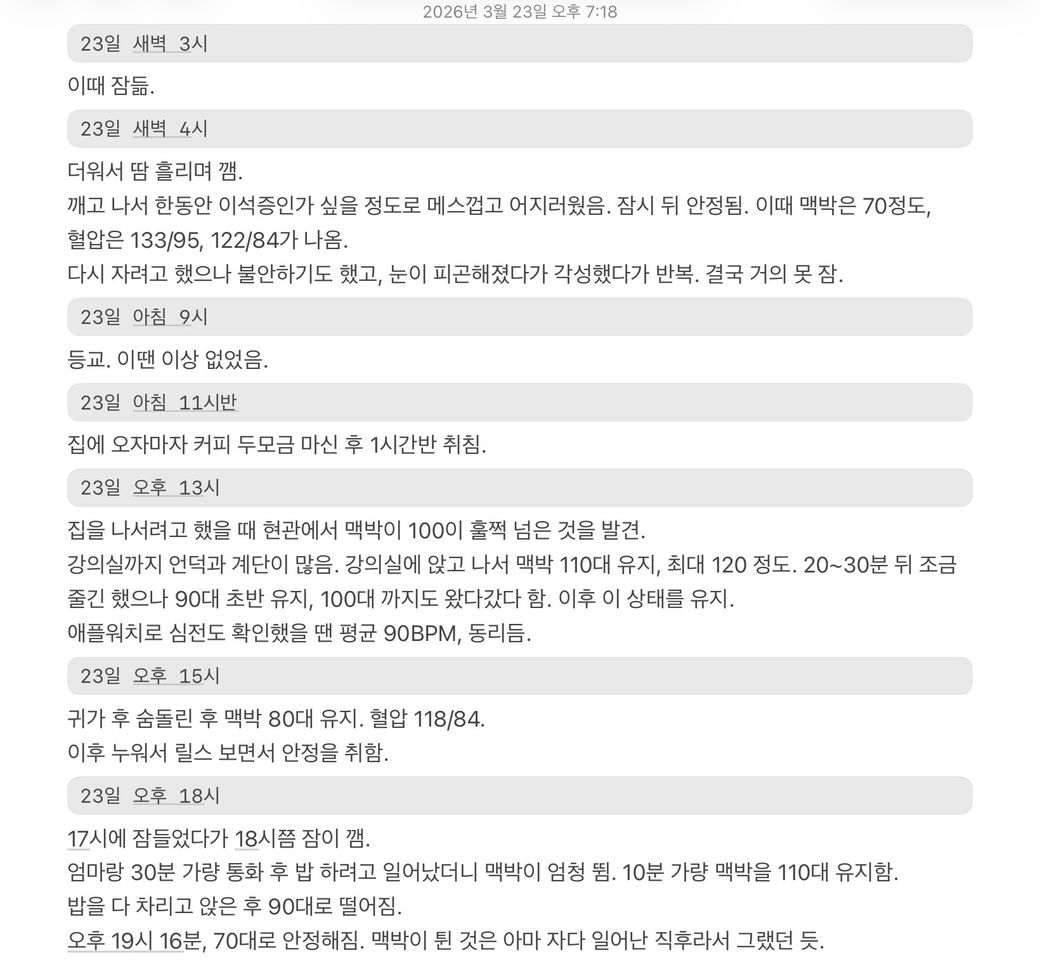 그리고 3월 23일 쯤, 자다가 깼을 때 메스꺼운 느낌과 컨디션이 좋지 않은 느낌이 들었고 어지럽기도 했습니다. 눈앞이 흐려지진 않았으나 정말 컨디션이 안 좋긴 했습니다. 잠을 거의 못 자고 개운하지 못하게 깰 때 느끼는 어지러움과 메스꺼움, 딱 그런 느낌이었던 것 같습니다. 이때 맥박은 70이었고 혈압은 133/95, 122/84 정도였습니다. 30분 정도 뒤에 괜찮아졌고, 이후 이 날의 자세한 내용은 사진으로 확인해주시면 감사하겠습니다. 잠을 못 자서 그런 건지 상황에 따라 심박이 100을 넘을 때가 많았던 하루였습니다.