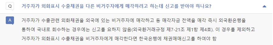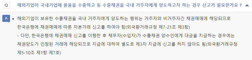 또한, 거주자가 수출관련 외화채권을 외국에 있는 비거주자에 매각하고 동 매각자금 전액을 매각 즉시 외국환은행을 통하여 국내로 회수하는 경우에는 신고를 하지 않아도 됩니다.(외국환거래규정 제7-21조 제1항 제4호). 이 경우를 제외하고 거주자가 외화표시 수출채권을 비거주자에게 매각한다면 한국은행에 채권매매신고를 하여야 합니다.