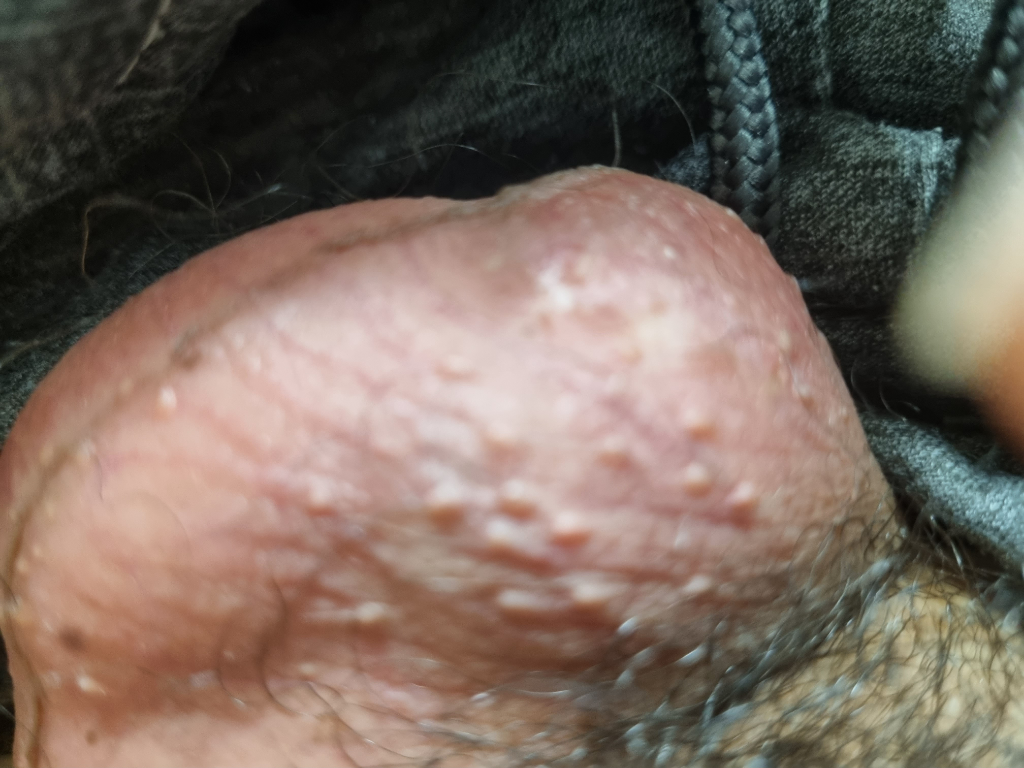 현재 사진상으로 명확한 판별은 어렵지만 곤지름이라고 하는 콘딜로마의 가능성이 있습니다. 곤지름은 인유두종바이러스 (HPV)에 의해서 발생하며 단일 혹은 무리를 이루어 발생하는 부드럽고 매끈하거나 융기된 구진이나 반점같은 병변이 항문과 성기 부위에 나타나는 경우 의심할 수 있습니다. 하지만 단순한 시진으로만 감별이 어려울 수 있어 조직검사 등이 필요할 수도 있습니다.