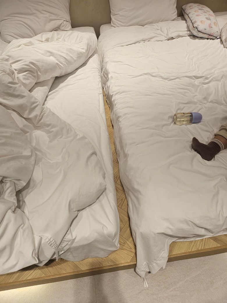 침대가 있는 방이라 낙상할까봐 침대두개를 붙여서