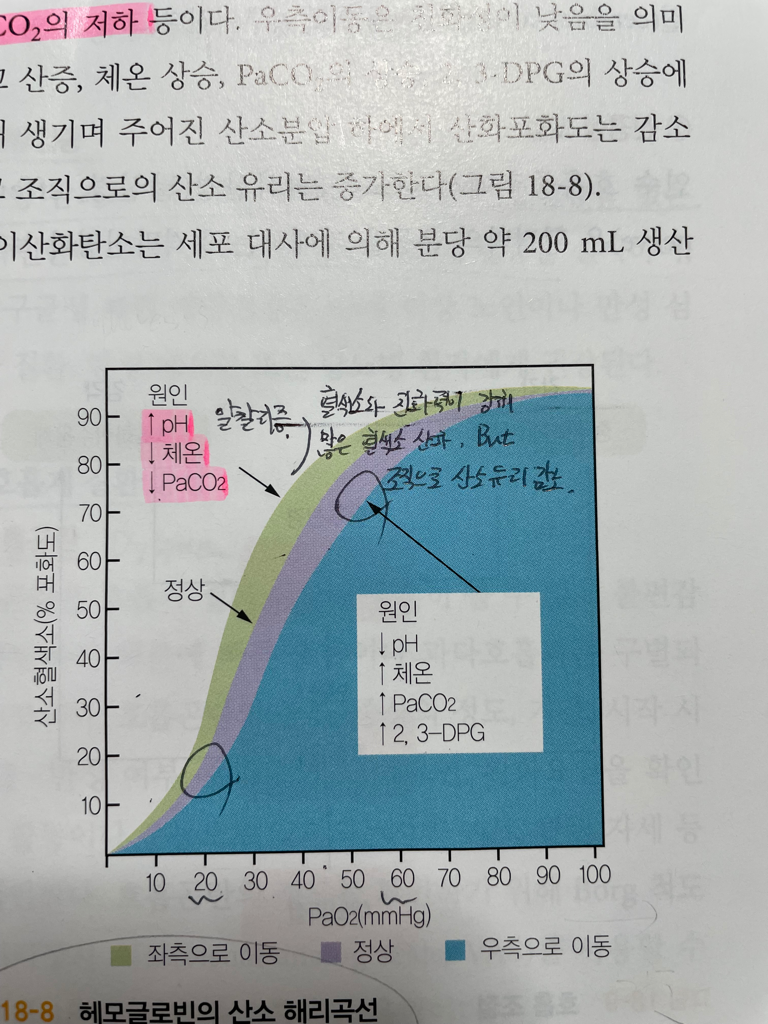 ' 곡선의 좌측 이동은 주어진 산소 분압 하에서 많은 혈색소가 산화되어 있는 반면 조직으로의 산소유리는 적어진다. '