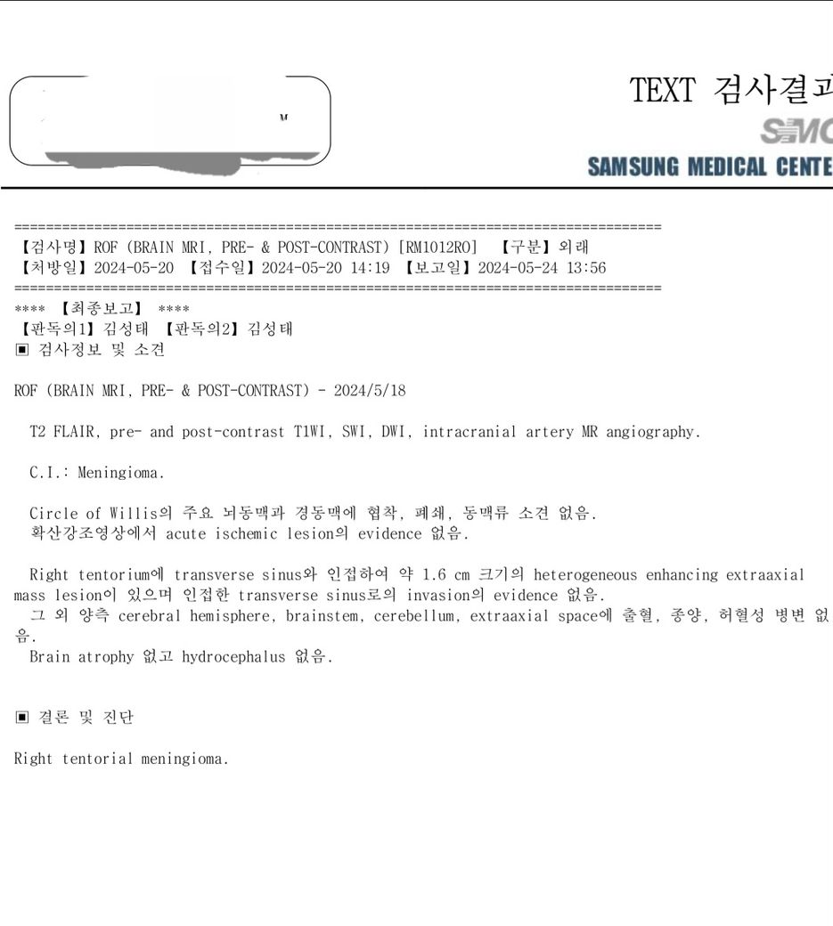 뇌 MRI 판독결과 입니다. 대학병원에서 수막종 이다. 사이즈가 작으니 6개월 경과관찰하자. 6개월 후 MRI 검사간 사이즈 변화 있으면 방사선 수술(감마나이프)하자. 혈관 주변에 있어 수술하기에 위치가 그렇고 사이즈가 아직은 크지 않아 방사선 수술 추천함.