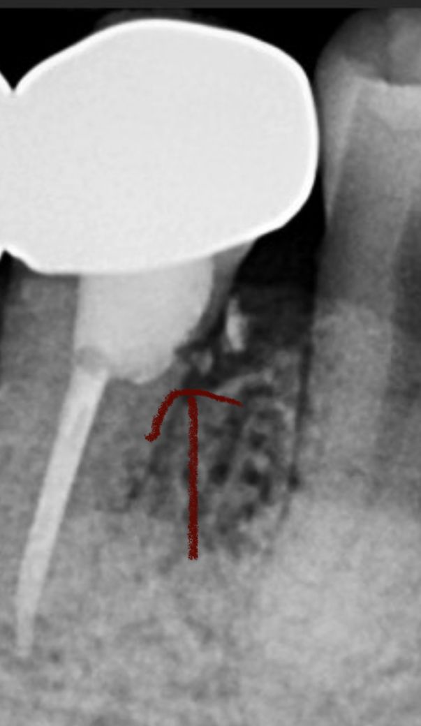 해당 부위는 치조골과 가까운 치아의 뿌리 쪽에 신경 치료나 그 외에 충치료를 하다가 구멍이 난 것으로 보입니다.