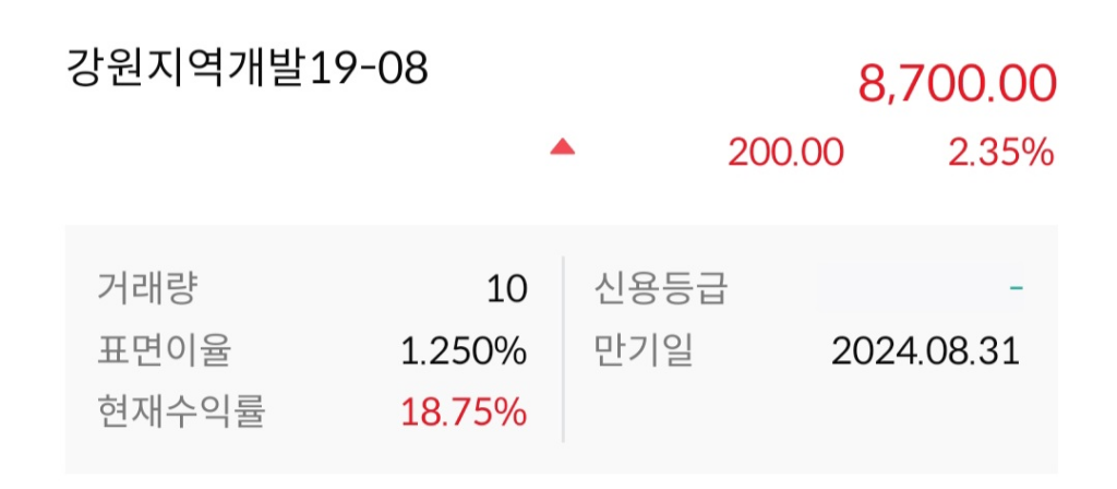 2. 강원지역개발19-08의 현재수익율은 18.75%인데 이게 갑자기 표면이율인 1.25%만큼 낮아질 가능성도 있나요?