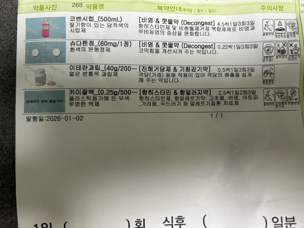 어제 저녁(2026.01.02.)에 감기로 약처방 받아와서 먹이고 오늘 아침에 코벤시럽과 카이잘액만 먹이고 가루약(슈다펜정, 이테란 과립)을 먹이지 않았습니다 ㅠㅠ