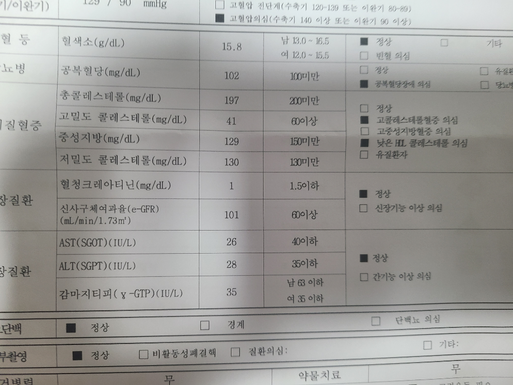공복혈당이 조금 높고 콜레스테롤 수치가 이상하지만 치료를 요하지는 않습니다.