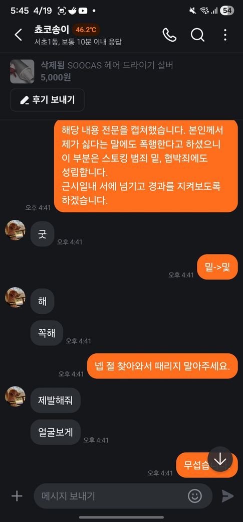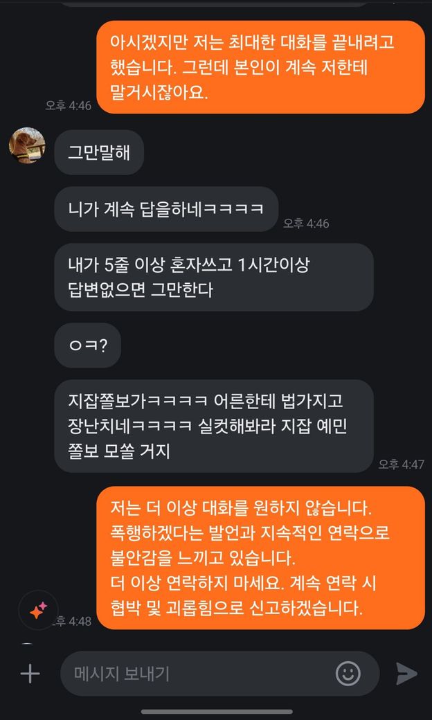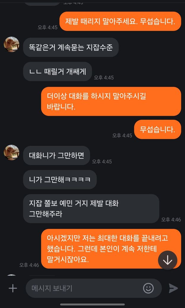 저는 지속적으로 판매자에게 연락을 하지 말아달라, 그만 대화하자고 했으나, 지속적인 판매자의 비꼬는 채팅 때문에, 아래의 내용이 시작되었습니다.