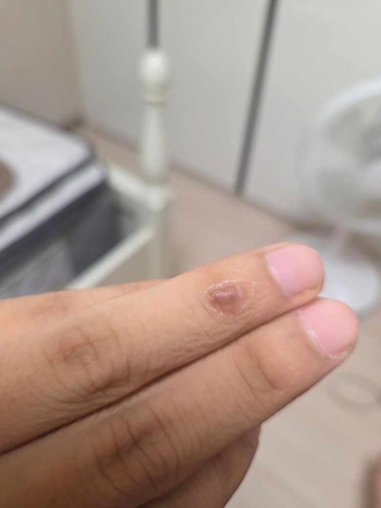 아령으로 손가락 찧은 지 3주정도 지났고 이제 아프지는 않습니다 그리고 x레이도 이상이 없는데 저렇게 살짝 검게 튀어나온 부분은 멍이 든건가요?