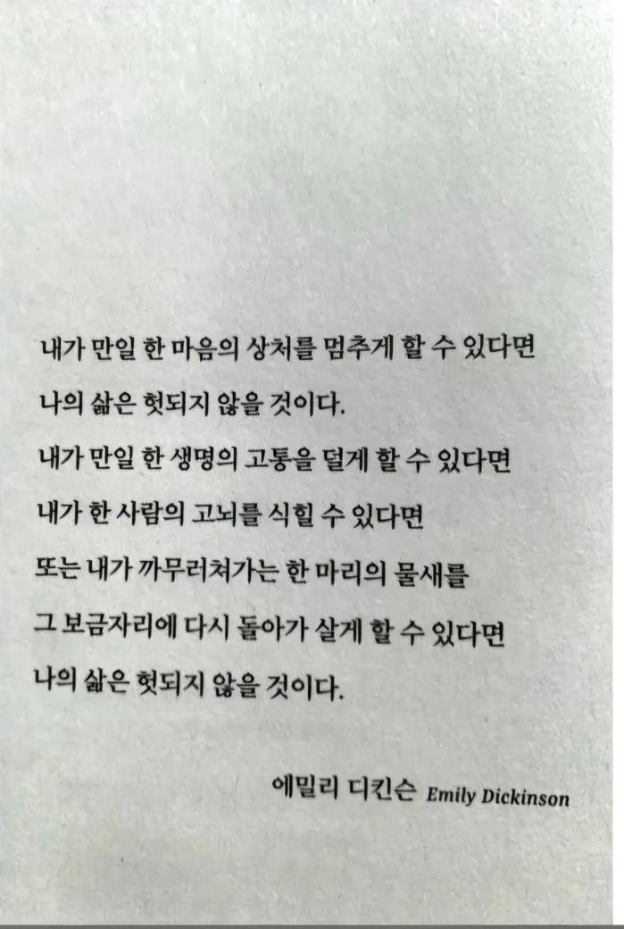 애밀리 디킨슨(1830~1886) 시인이 쓴 책의 내용으로, 사람의 삶의 이유와 목적이 다르듯이, 사람이 절망에 빠져 있을때 우리가 숨쉬고 있는 자체가 너무나 감사하고 기쁜 일이나 그 행복을 모르는 것입니다. 애밀리 디킨슨은 2000여편의 시를 쓰면서 평생 독신으로 살아왔다고 합니다.