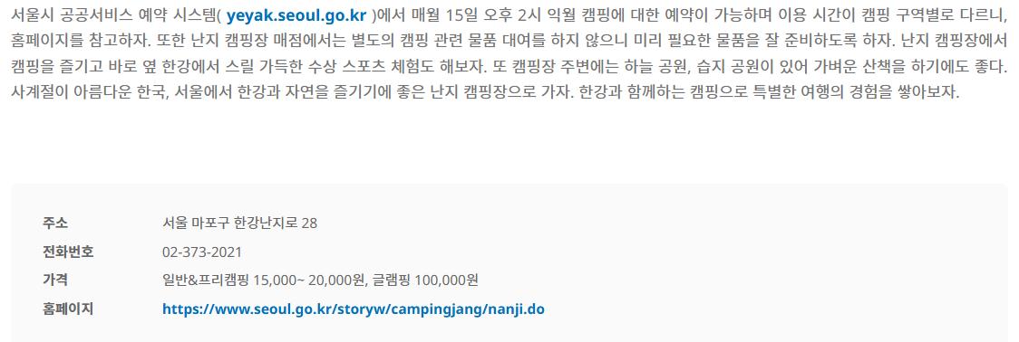 * 난지캠핑장은 서울특별시 마포구 상암동 495-81에 위치하고 있습니다. Google 지도 에서 평점은 3.9점입니다.