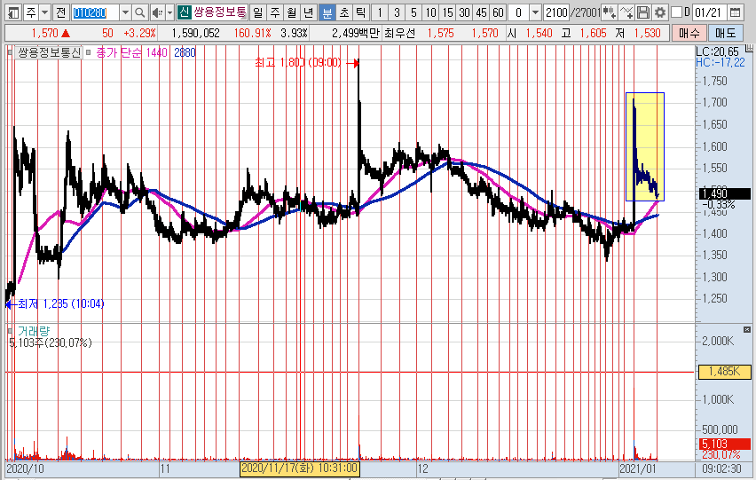 이 종목이 2상한가 이후에 오늘 급락? 이라고 보기에는 좀 그렇고 강한 조정을 받았는데요 분봉 분석을 하실줄 않다면 이종목은 적은 거래량을 주가를 급락시켜놓고 -13~10% 사이에서 단기 물량을 매집한것으로 보입니다