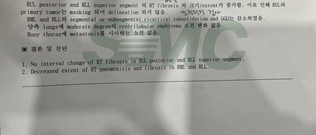 1. 폐상부/하부의 (우측 or 방사선 치료 후) 섬유화는 변화 없음