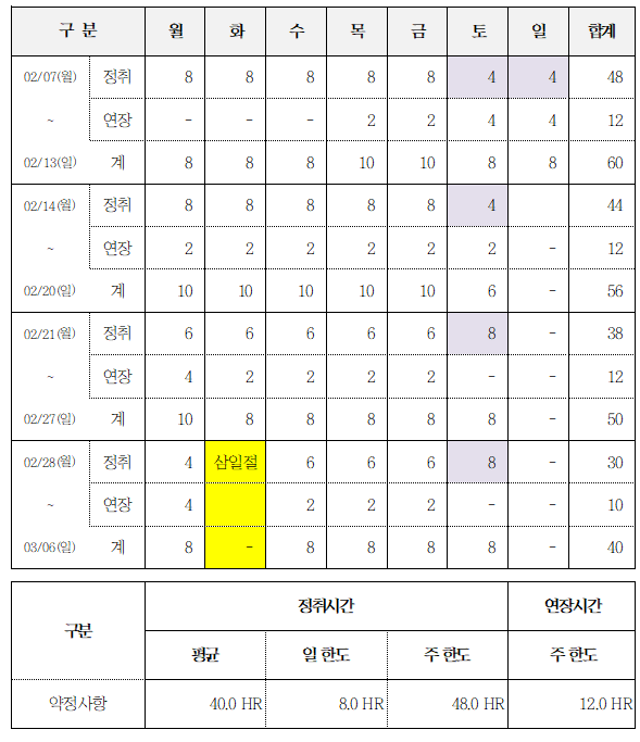 이 표는 3/1일에 근무를 안한다고 가정하고 평균 소정근로시간을 40시간으로 맞췄습니다
