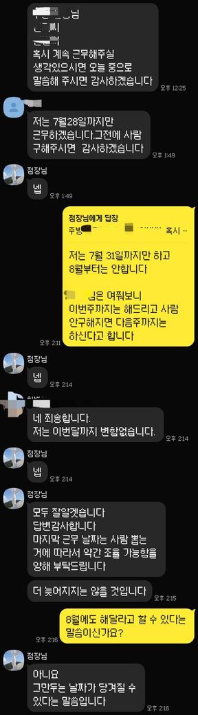 이런 형태의 발언은 해고 통보 아닌가요? 7월 31일에 나가겠다 했는데... 저기다 대고 일단 넵 알겠습니다 라고 했거든요 이 사람이 하는거 해고 아닌가요...? 왜 마지막 근무일을 점주가 정하나요?? 작년 12월부터 다녔고 4대보험도 안해줍니다 ㅋㅋㅋㅋ...