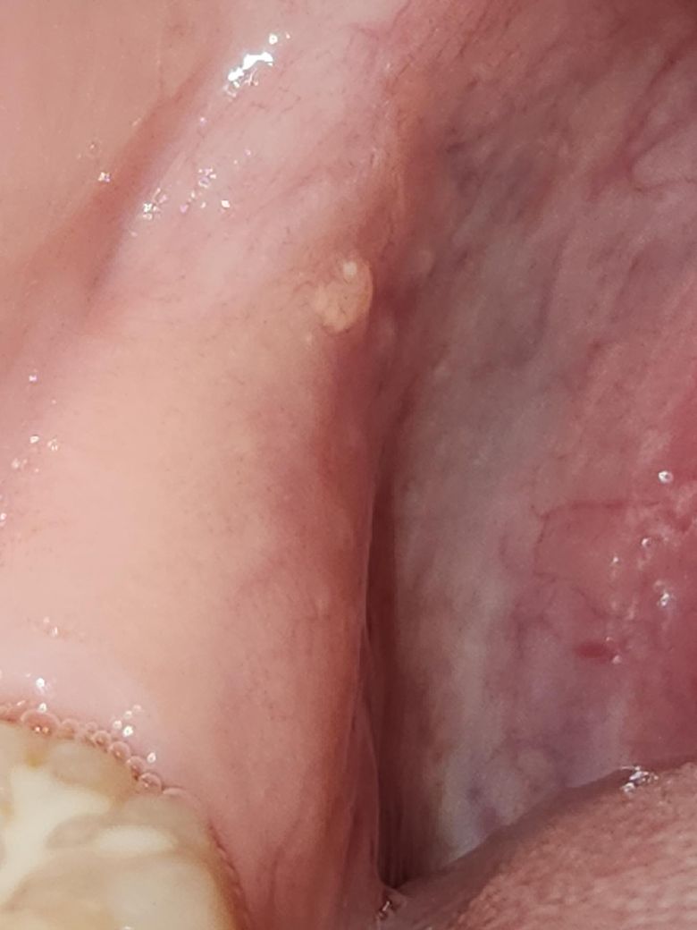 사진이 흐려 명확하지는 않으나 구강내에서 생길 수 있는 일종의 사마귀양의 양성종양 또는 유두종 등으로 보입니다. 크기가 지속적으로 커질 수 있으며 정확한 것은 제거 후 조직검사해봐야 알 수 있습니다.