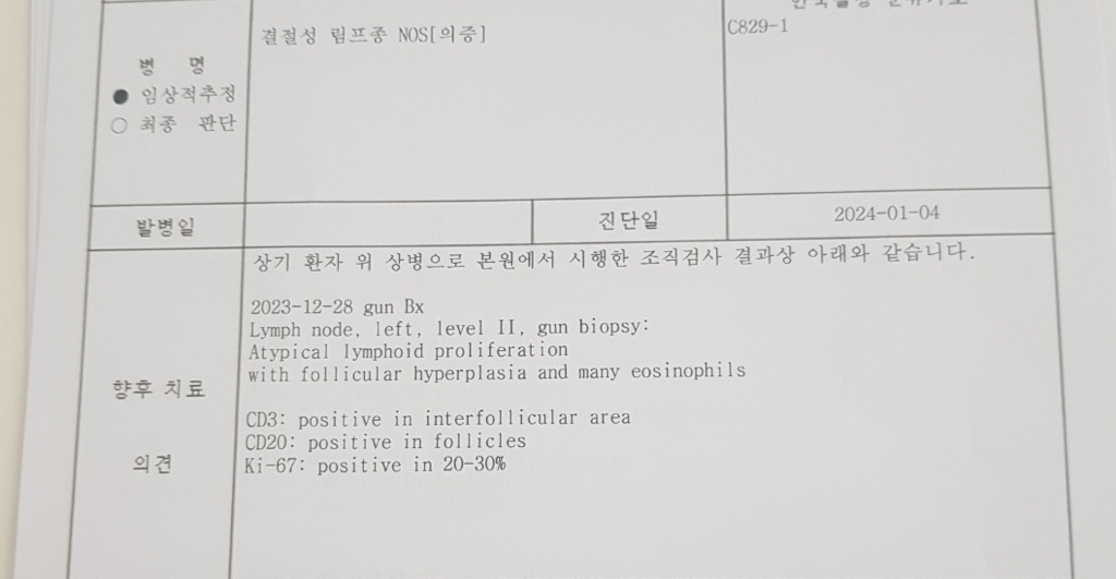 사진에 제시된 의료 소견에 따르면, 왼쪽 목의 림프절에서 비정형적인 림프구 증식과 여포성 증식이 관찰되었고 많은 호산구가 존재한다고 기술되어 있습니다. CD3와 CD20 항체가 각각 간엽부와 여포에서 양성 반응을 보였고, Ki-67이 20-30% 양성 반응을 보이는 것은 세포의 증식 활동이 일어나고 있음을 나타냅니다.
