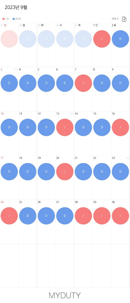 이번 9월달은 주말갯수가 총 9개이며, 추석 연휴 2일까지 합하여 휴무일은 총 11회여야 하는게 맞다고 생각하였으나, 이번달 근무표는 휴일이 총 9개로 최종 확정이 되었습니다.
