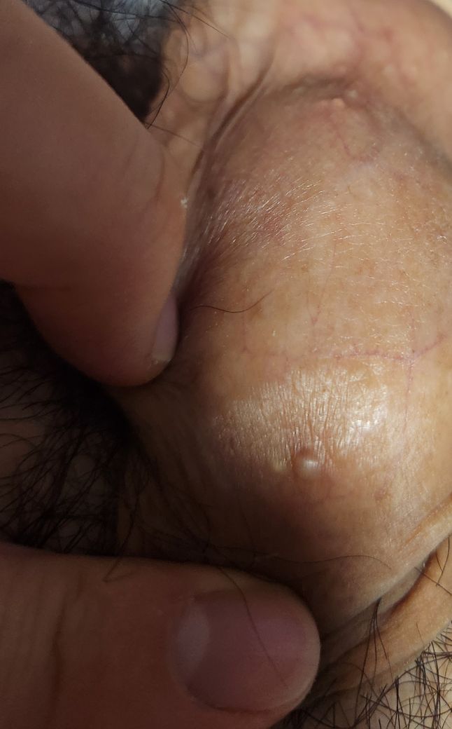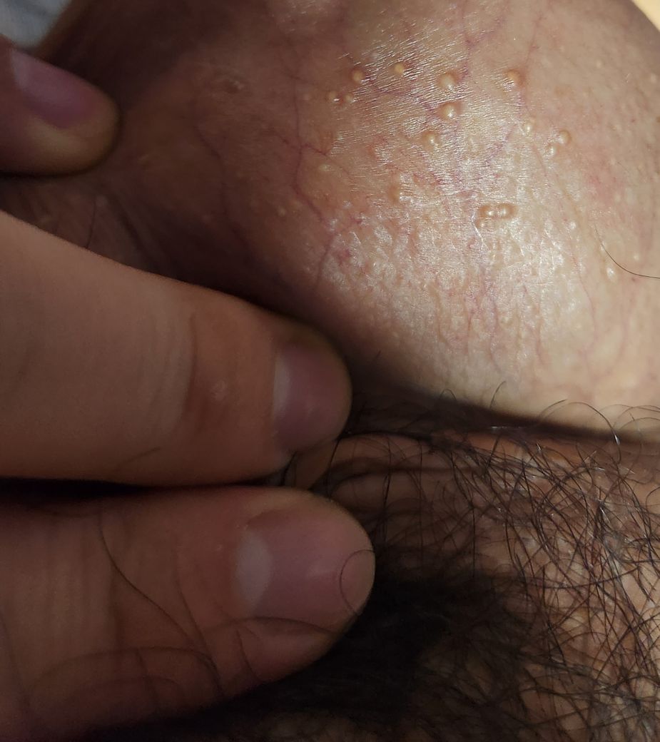 약 1달반 전부터 음낭, 기둥에 사진과 같이 하얀 좁쌀 같은 것들이 많이 생겼습니다. 전혀 아프거나 가렵지 않고 짜지지도 않는데 무엇일까요?? 관계는 한달에 한 두번 가지며 상대방은 성병이 없고 저 또한 다른 관계는 갖지 않았습니다.