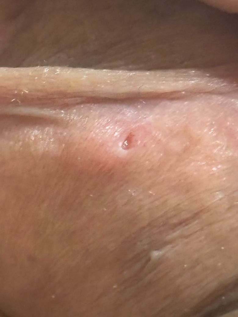 매독에 걸렸을 때 발생하는 성기의 궤양을 경성하감이라고 부르는데, 사진의 병변은 전형적인 경성하감 소견은 아닙니다. 뾰루지 같은 것이 생긴 것을 짜고 나서 해당 상태가 되었다면 단순히 흉터가 남은 소견일 가능성이 상대적으로 높을 것으로 사료됩니다.