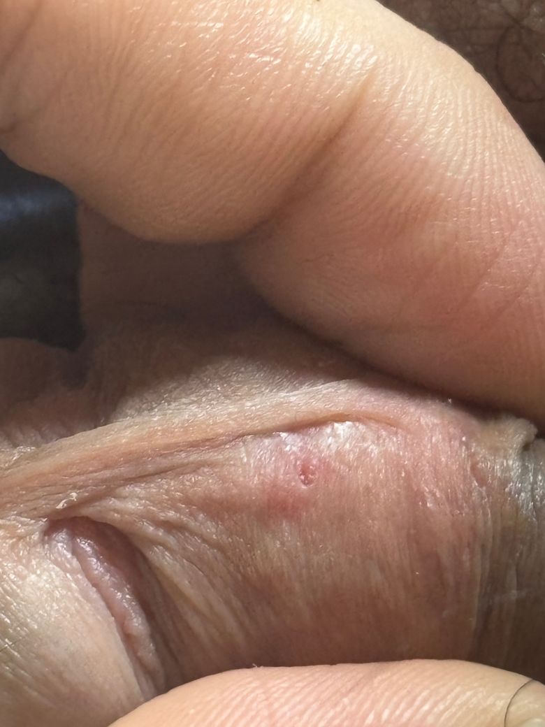 세달 쯤 전 구강성교 이후 뾰루지 같은게 나서 짜고난 이후에 저 상태로 현재까지 남아있습니다. 정말 그대로 계속 남아있어요